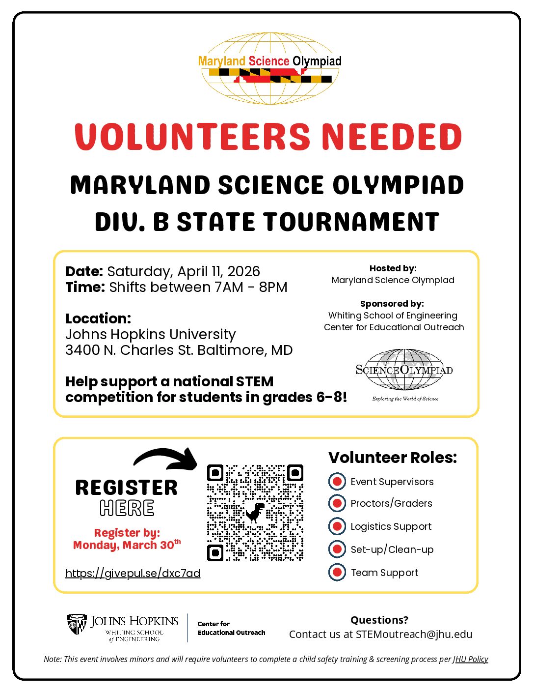 About: Maryland Science Olympiad (MSO) is hosting the annual State tournament for the top 25 middle school teams across Maryland to compete for a spot at Nationals. Students will compete in 23+ STEM events like anatomy, forensics, and engineering design challenges. Volunteers will help as proctors, graders, judges, timers, and many other logistics roles. No previous experience required!